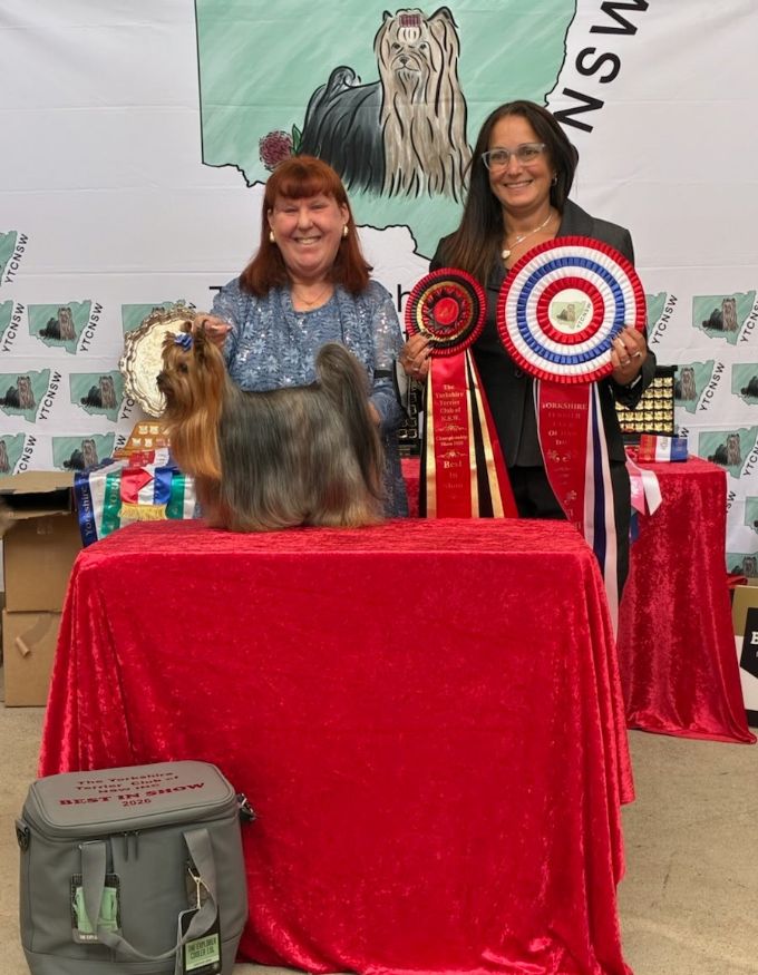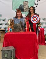 Pictured with Owner/Handler Jacquie Moore Breeder A & L Chcorane Baledda Yorkshire Terriers, Specialty Open Show